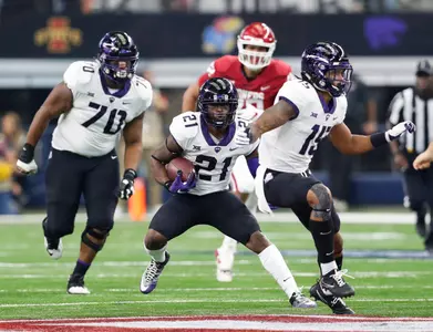 On fourth-and-1 from the Oklahoma 41 on the next drive, Hill bootlegged to the right side. Big defensive end Ogbonnia Okoronkwo chased him toward the sideline before Parnell Motley delivered the crushing blow that kept TCU's quarterback from getting a first down.