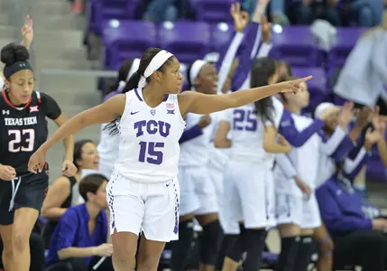 FORT WORTH, Texas -- TCU overcame a cold start and cruised down the stretch in a 76-62 win over Texas Tech at Schollmaier Arena on Wednesday night. With the win, the Frogs jumped into a tie for fifth place in the Big 12 standings.
