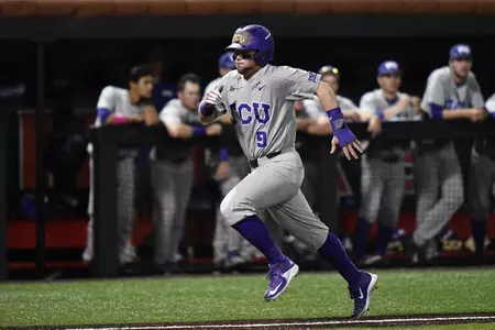 NORMAN, Okla. – A three-run ninth inning for No. 5 TCU helped the Horned Frogs rally for a 9-6 victory over No. 24 Oklahoma Friday night. The win guarantees TCU at least a share of the Big 12 regular season title, it's second in the last three seasons.