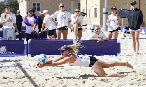 Jordan Westendorff and Brooke Sassin, who went 4-0 for the weekend, recorded the first point for the Frogs with a 21-14, 21-18 over HBU's Danielle Wheeler/Mikayla Vivens. Molly Scheel and Jensyn Bledsoe defeated Bailey Banks/Katya Silveria 21-13, 21-7 for the Frogs' second point, setting the table for Bergeson and Greene.